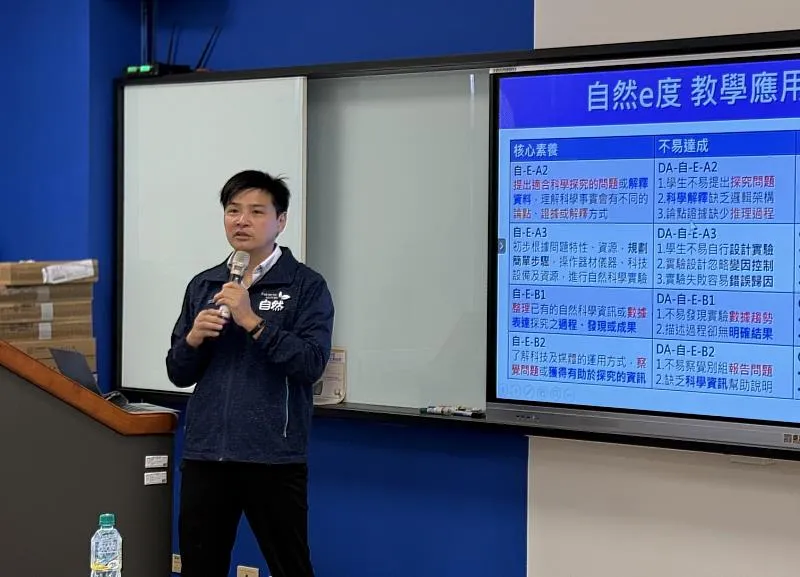 講者說明 e度教學在自然科領域的應用,解析如何透過數位科技提升探究與實驗學習的成效