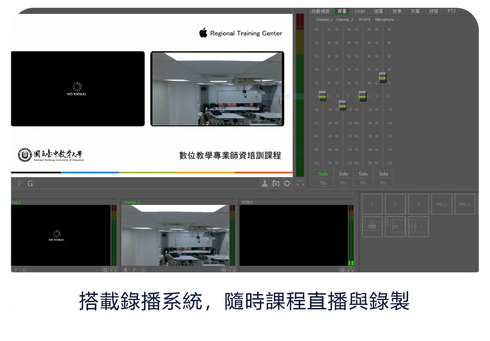 智慧教室充分整合現代教學科技,配備多功能錄播系統,並結合自動追蹤攝影機,實現課程直播與錄製,讓學習者得以隨時隨地參與課堂。如此不僅能夠最大化學習資源的利用,也能提升教學的靈活性,滿足即時教學需求的同時,也能增進遠距學習時的參與感。