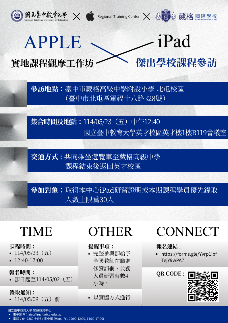 (四)參加對象:高級中等以下學校,且取得本中心iPad課程研習證明或本期課程學員優先錄取,人數上限為30人。