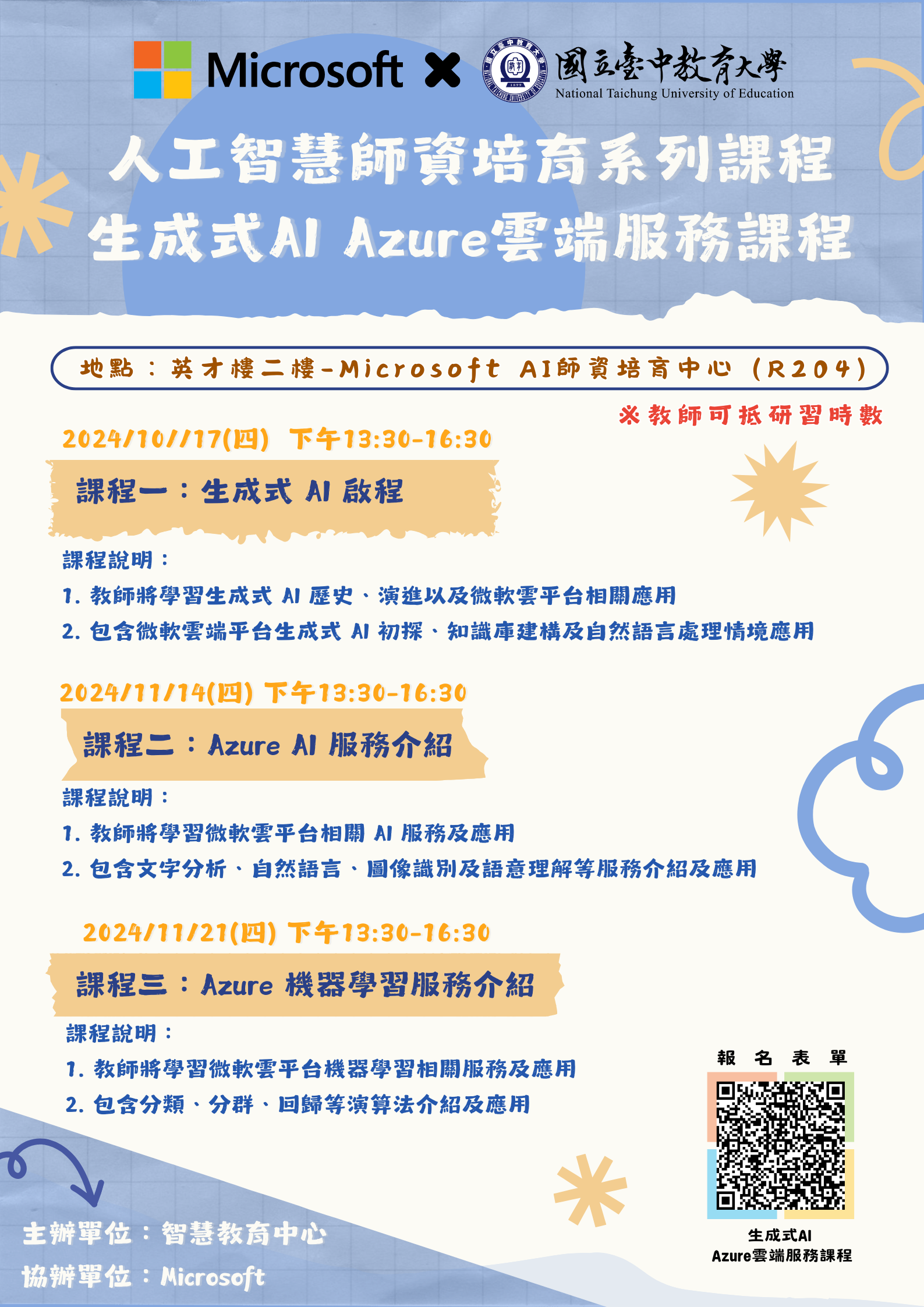 以下課程皆於英才校區英才樓二樓Microsoft AI師資培育中心(R204)開課,詳細如下: