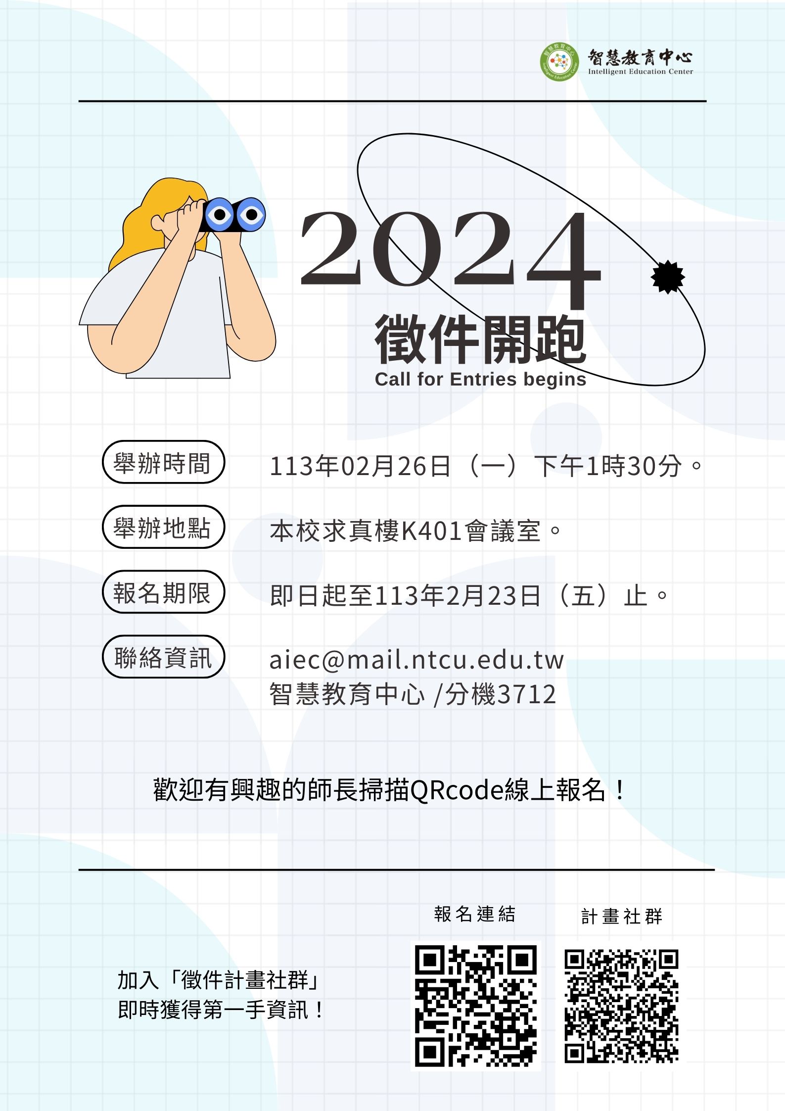 二、本中心訂於 113 年 2 月 26 日(星期一)下午 3 時 30 分於求真樓 K401 會議室舉辦「113年度智慧教育中心計畫徵件說明會」,針對 113 年度徵件計畫進行說明,並邀請上期參與計畫之計畫主持人分享執行經驗,歡迎有興趣之師長踴躍報名參加。徵件計畫說明會報名網址:https://forms.gle/h5Gzb3vTYMJhXsR28;報名期限至 113 年 2 月 23 日(星期五)下午 5 時為止。