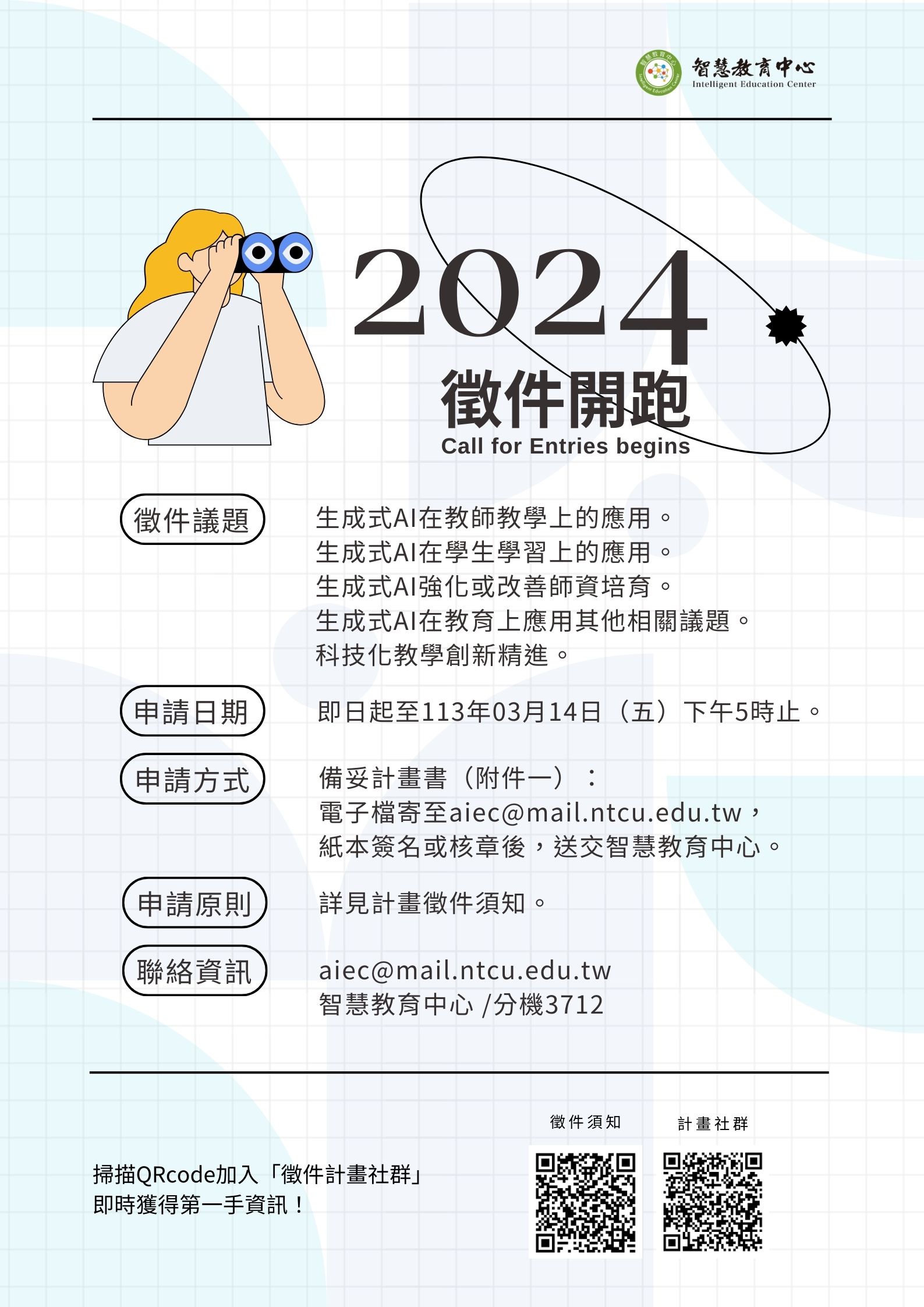 七、徵件詳情請參閱附件,本案聯絡窗口:智慧教育中心陳小姐,E-mail:aiec@mail.ntcu.edu.tw,聯絡電話:04-22183712