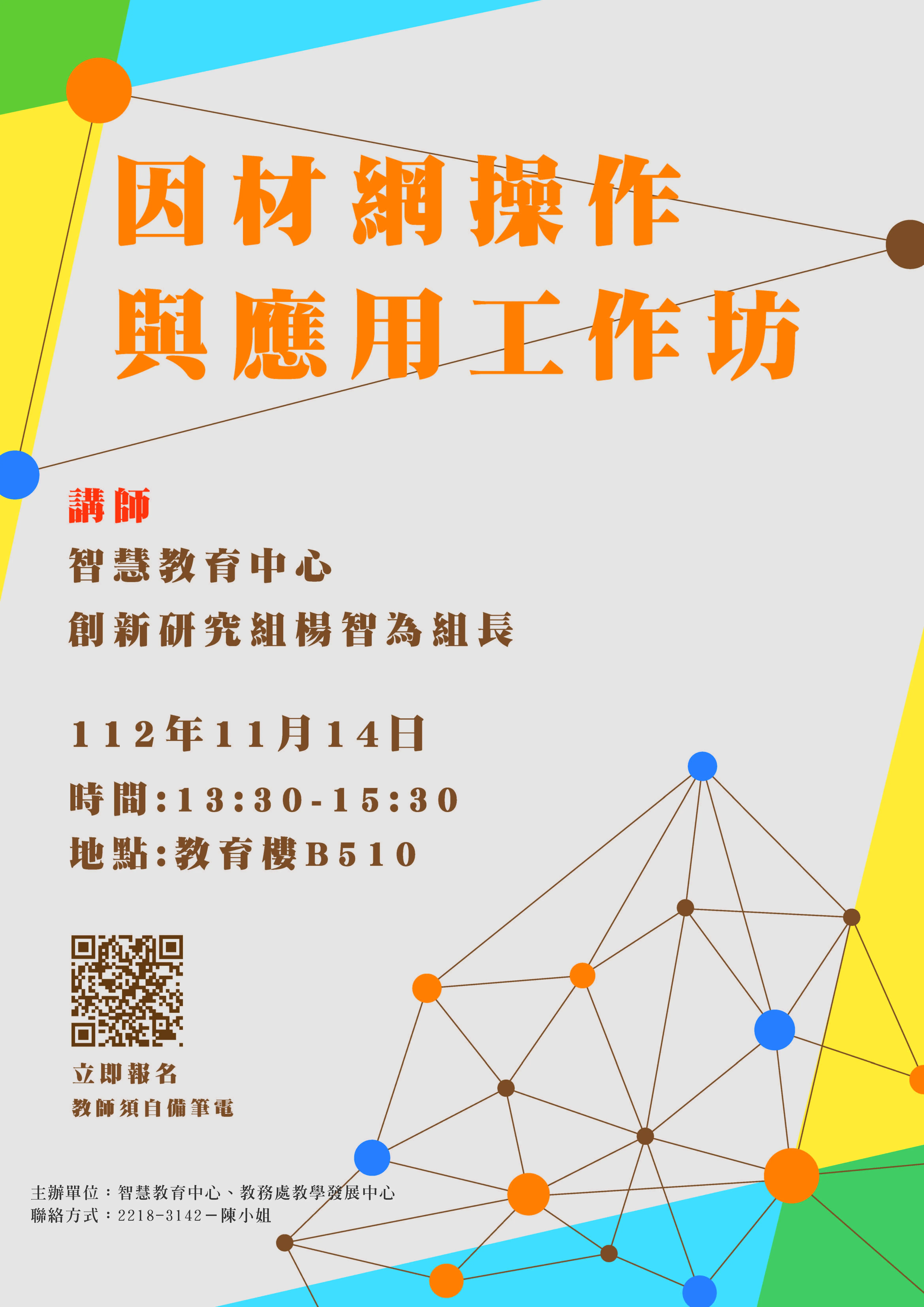 本校智慧教育中心與教學發展中心於112年11月14日 (二)共同主辦「因材網操作與應用工作坊」,歡迎校內教師踴躍報名參加!