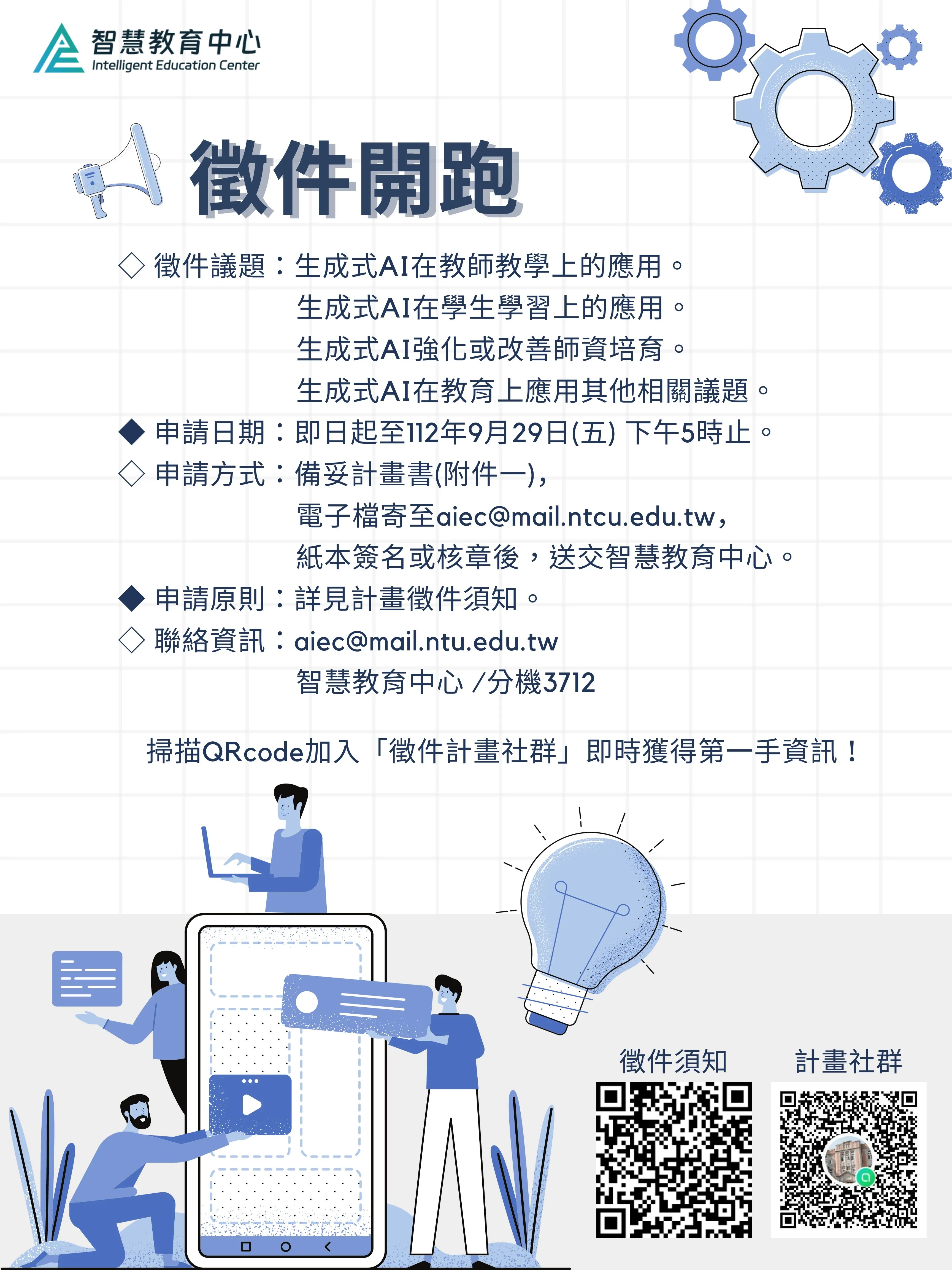 徵件詳情請參閱附件,本案聯絡窗口:智慧教育中心,E-mail:aiec@mail.ntcu.edu.tw,聯絡電話:04-22183712。
