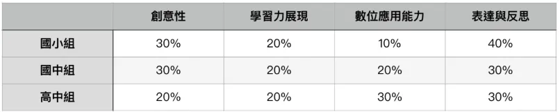 • 評分指標:作品應展現學生在課程主題中的知識掌握與技能應用,同時呈現探索、研究、嘗試過程。