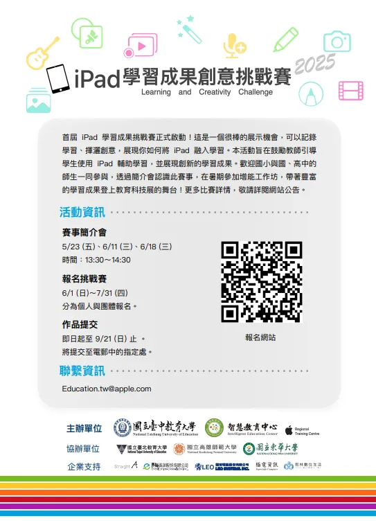 • 參賽建議:鼓勵使用多種 iPad App(如 Keynote、Pages、Clips、iMovie等),並結合不同媒體(文字、影像、聲音),展現數位工具的整合能力。指導教師可引導學生在創作中「選擇最適合的工具」來完成作品。