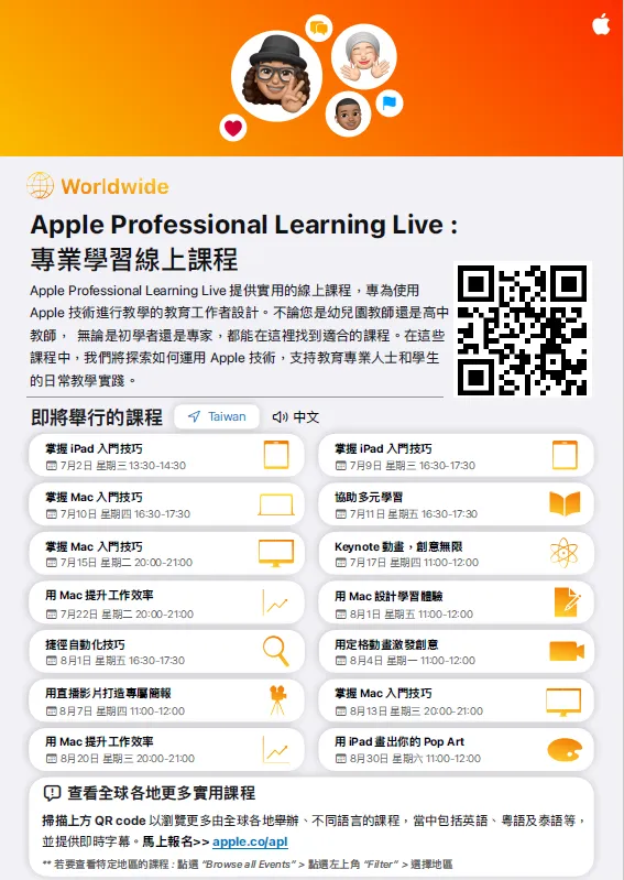 (四)114年7月11日(星期五)下午4時30分至5時30分,課程主題:協助多元學習,報名網址:https://s.apple.com/di0T7t3RM1。